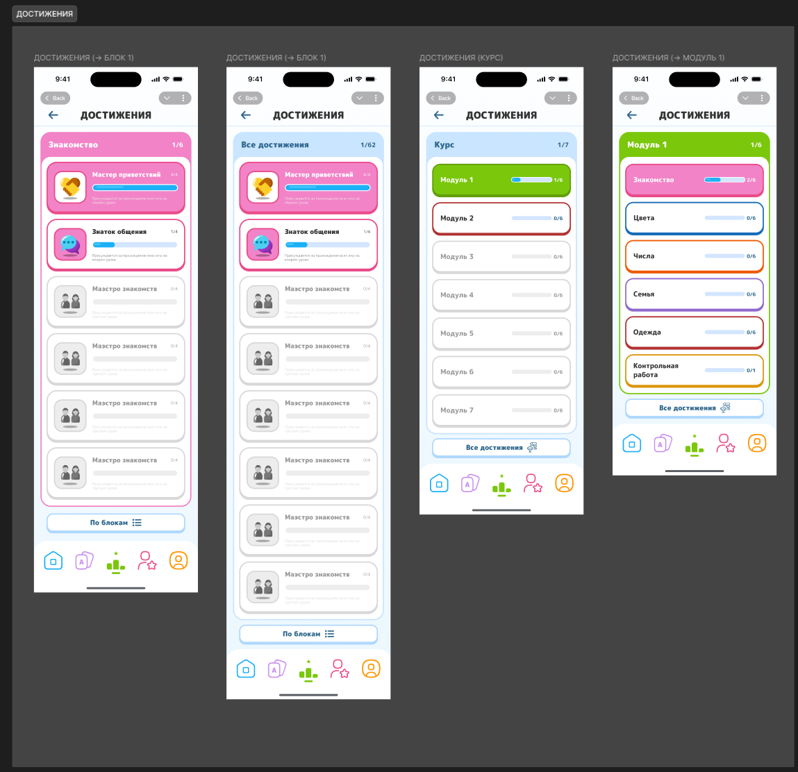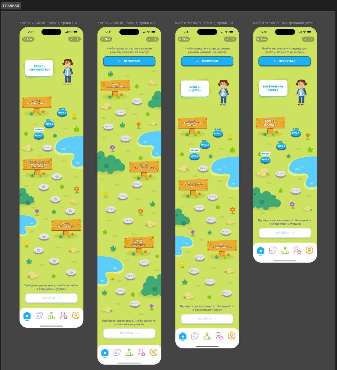 Моей задачей было сделать простой и понятный дизайн, который при этом привлекал бы внимание детей к обучению. Итоговый результат и некоторые страницы показаны ниже.